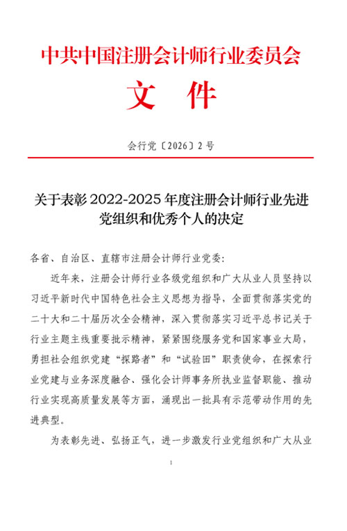 近日,收到中共中國注冊會計師行業(yè)委員會文件《關于表彰2022-2025年度注冊會計師行業(yè)先進黨組織和優(yōu)秀個人的決定》,我所主任會計師吳林海同志榮獲注冊會計師行業(yè)“優(yōu)秀黨務工作者”稱號。 此次榮獲“優(yōu)秀黨務工作者”稱號,不僅是對其個人工作的認可,也是對我所黨建工作的高度肯定。 我所將以此次獲獎為契機,進一步加強黨建工作,深化黨建與業(yè)務融合,提升服務質(zhì)量,堅守職業(yè)道德,不斷增強服務國家戰(zhàn)略、服務經(jīng)濟發(fā)展、服務社會公眾的能力。 附件: